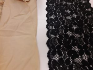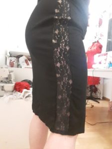 mustaan kapeaan mekkoon lisättyilluusiopaneli, ihonvärinen vuori ja musta pitsi päälle antoi lisää leveyttä vaatteeseen,