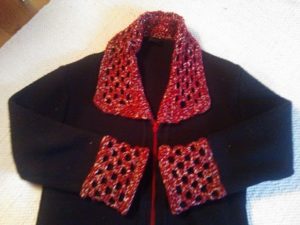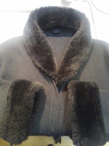 Paksu musta villatakki tekoturkissomistein – otin irti mustat koristeet, koska halusin väriä tilalle. Toteutin väriosat virkkaamalla sekä lisäsin samalla päällä ommeltuna virkatut taskut, lisäsin vyön ja koska lankaa jäi virkkasin lierihatunkin 😀