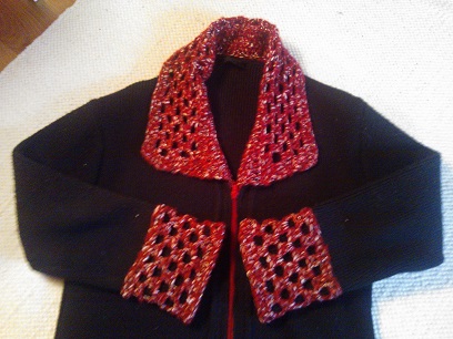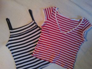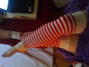 tässä tapauksessa tein punaraitaisen paidan hihoista säärystimet lisäämällä pitsit ylä ja alareunaan.