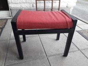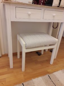 Kirpputorilta löydetty pieni musta jakkara – tarvitsi välitöntä hoitoa. Vanha istuintyyny oli aivan haperoitunut ja runko liian tumma itselle. Tässä oli suurempi työ purkaa, korjata runkoa ja hioa sekä päällystää tyynyineen istin uudestaan.
